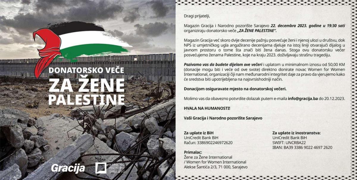 Magazin Gracija i Narodno pozorište Sarajevo (NPS) večeras u 19 sati i 30 minuta organizuju Donatorsko veče za žene Palestine i pozivaju sve zainteresovane da učestvuju u donacijama i pridruže se događaju u NPS.