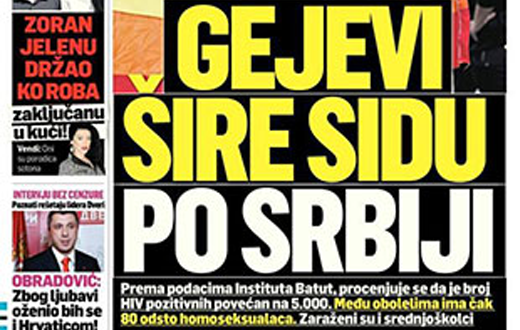Dvobroj opskurnog beogradskog tabloida "Srpski telegraf" (16-17. april) donio je žestoki napad na gej populaciju, napis kakav se ne pamti još od devedesetih i targetiranja ljudi drugih nacionalnosti, te "izdajnika i plaćenika" u srbijanskim štampanim i elektronskim medijima. Pod naslovom "Gejevi šire sidu u Srbiji", na naslovnoj strani i kombinacijom podataka i nenaučnih, štaviše nerazumnih stavova i mržnje, list donosi potjernicu i ugrožava temeljno pravo na život i bezbjednost osoba zaraženih HIV virusom.