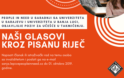 Humanitarna i razvojna organizacija People in Need BiH je u saradnji sa banjalučkim i sarajevskim univerzitetima objavila poziv studentima i studenticama za učešće u takmičenju "Naši glasovi kroz pisanu riječ".