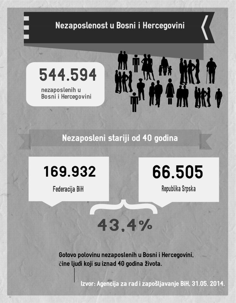Prema evidenciji Federalnog zavoda za zapošljavanje, od ukupnog broja nezaposlenih u Federaciji BiH, zaključno sa 31.05.2014., 169.932 njih su osobe starije od 40 godina. U Republici Srpskoj, prema podacima koje smo dobili od Zavoda za zapošljavanje RS-a, zaključno sa 31.06.2014. godine, na evidenciji zavoda je bilo 66.505 nezaposlenih osoba iznad 40 godina.