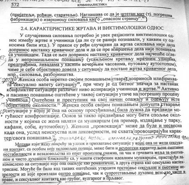 Jedan od slučajeva koji dokazuje društvenu atmosferu i nekažnjivost silovanja, te prikazuje žrtvu kao krivca, je sadržaj udžbenika Krivično pravo, na Pravnom fakultetu u Kragujevcu. Autor, redovni profesor Branislav Simonović, ni posle intervencije poverenice za ravnopravnost Nevene Petrušić, nije iz knjige izbacio sledeći diskriminatorski sadržaj: "U praksi su ređi slučajevi da žrtva silovanja nije dala doprinos nastanku krivičnog dela i da se pre izvršenja dela nije poznavala sa učiniocem. Tada se njen doprinos nastanku krivičnog dela najčešće ogleda u nepromišljenom ponašanju (usamljenom kretanju mračnim ulicama, predgrađima, livadama u kasnim večernjim satima, putovanju autostopom), čime je sebe objektivno dovela u situaciju da postane žrtva krivičnog dela, npr. silovanja, razbojništva".