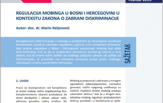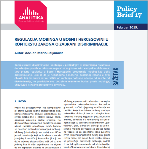 Analizirajući zakonski okvir za zaštitu od mobinga u BiH u svjetlu uvida iz zakonskih rješenja i prakse u Srbiji, saradnik Analitike Mario Reljanović ističe kako je u BiH neophodno donošenje posebnog zakona u ovoj oblasti koji bi pravni režim zaštite od mobinga potpuno odvojio od zaštite od diskriminacije, te predvidio sve potrebne elemente borbe protiv mobinga.