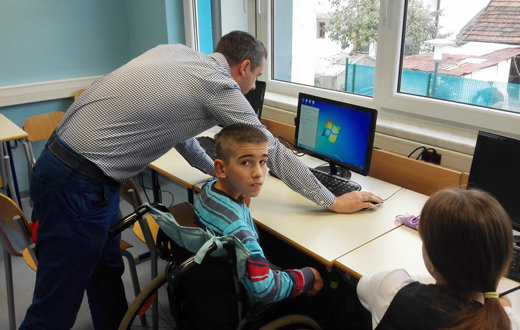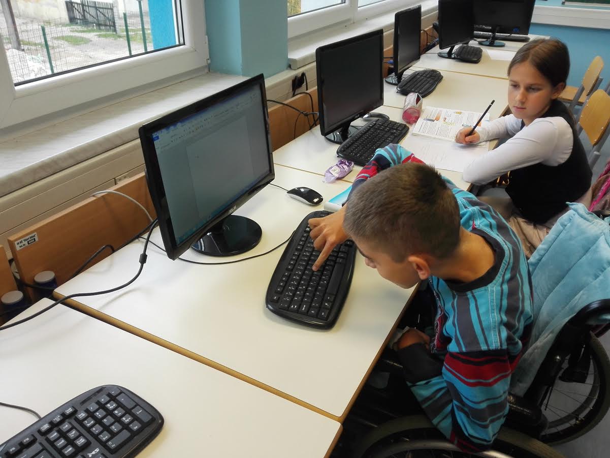 Farisa smo našli u kabinetu informatike. Uz pomoć nastavnika, kucao je neke riječi. Drugarica koja je sjedila pored njega, pomno je pratila šta piše.