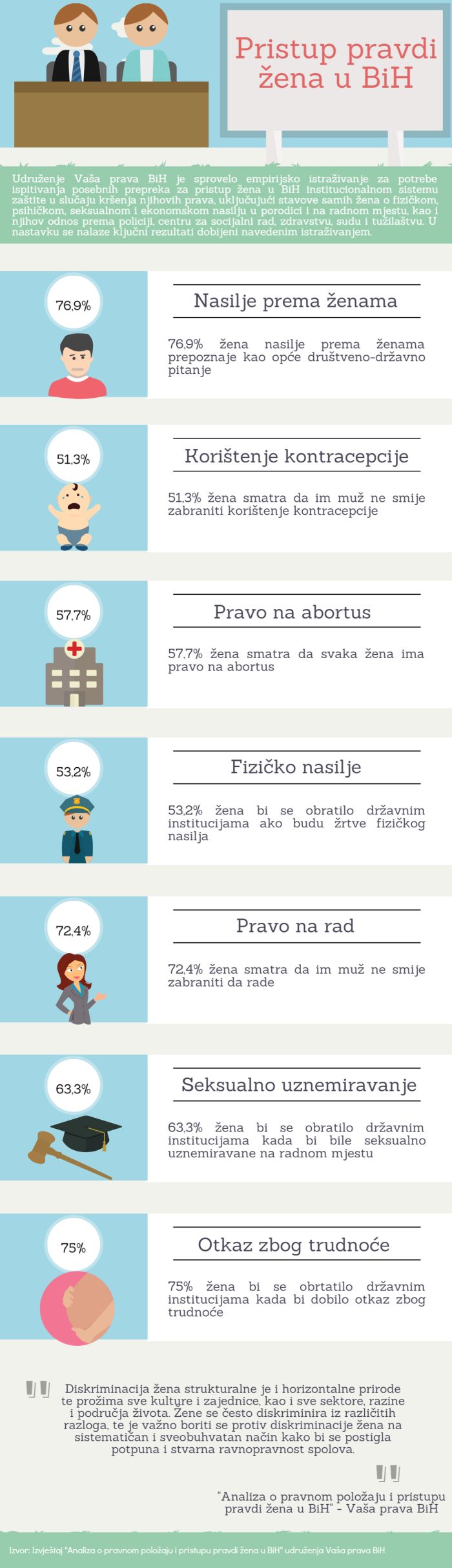 Tim povodom je udruženje Vaša prava BiH objavilo izvještaj “Analiza o pravnom položaju i pristupu pravdi žena u BiH“ u okviru kojeg je sprovelo i empirijsko istraživanje o preprekama na koje žene nailaze, kada traže zaštitu svojih prava u institucijama.