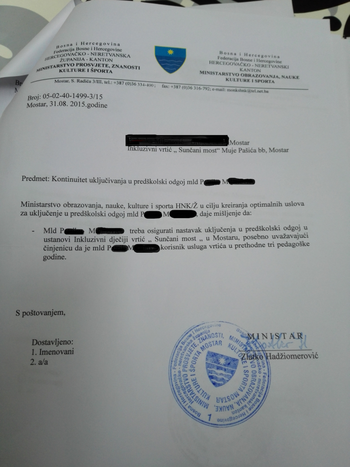 U međuvremenu, ministar obrazovanja, nauke, kulture i sporta HNK se promijenio, došao je novi. Roditelji P.M. su dobili identičan odgovor, odnsno preporuku i od novog ministra, uz obećanje da će ministarstvo obezbijediti mobilni tim i asistenta, samo da se dijete vrati u vrtić.