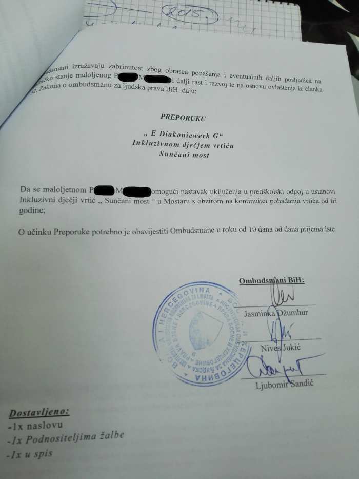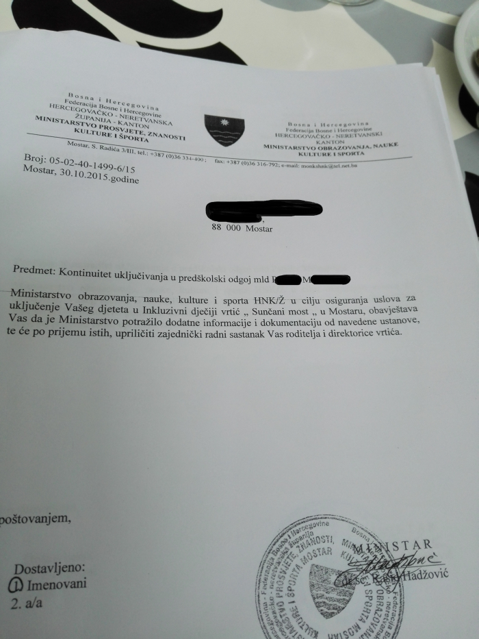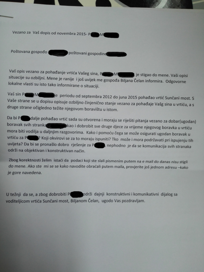 Sa zvaničnim dokumentom Službe, roditelji su otišli u vrtić, tražili upis, jer su - bez obzira na to šta se dešavalo prethodnih nekoliko mjeseci - smatrali da je taj vrtić ipak najbolji za njihovo dijete.