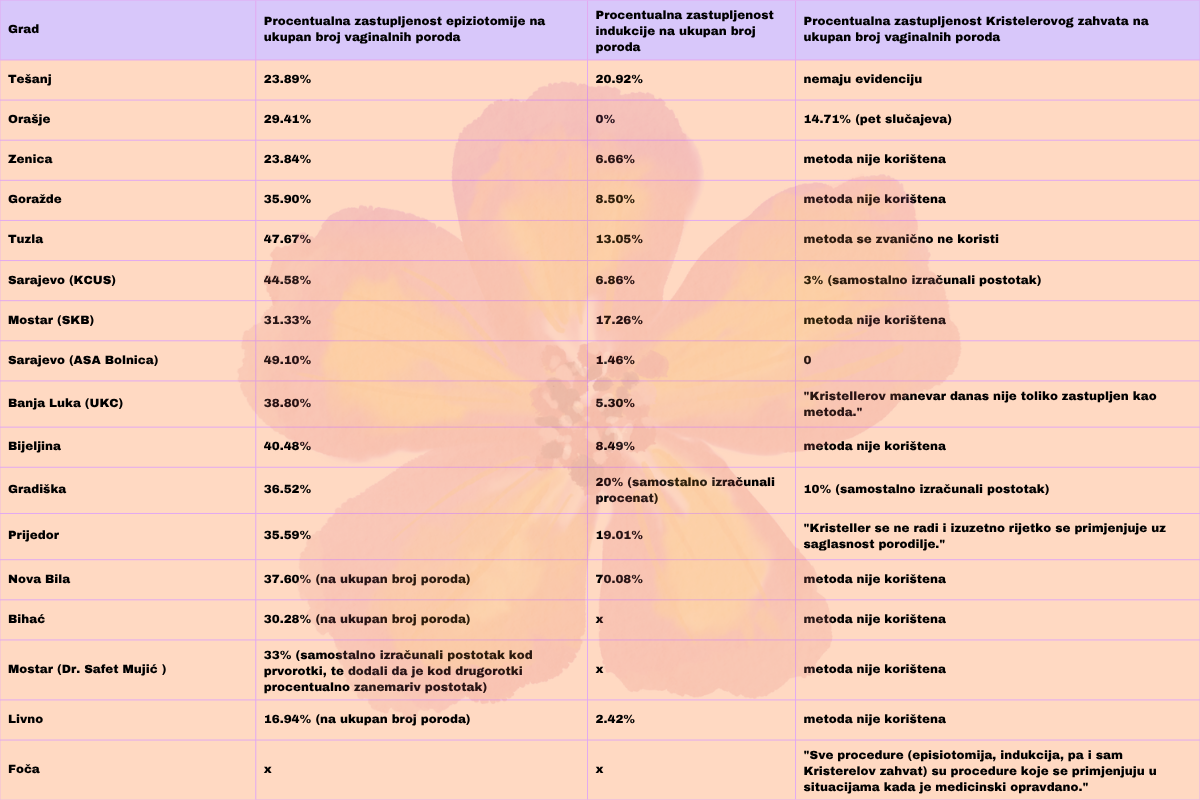 Iskustvo naše sagovornice nije rijetkost. Svjedočenja žena koje prikupljaju nevladine organizacije ukazuju na to da se u bolnicama širom Bosne i Hercegovine i dalje rutinski i nepažljivo koriste akušerske procedure kao što su epiziotomija, nalijeganje na stomak ili ubrzavanje poroda. Za potrebe ovog istraživanja upiti o zastupljenosti pojedinih akušerskih procedura poslati su bolnicama širom BiH, a podaci koje je dio porodilišta dostavio variraju i ukazuju na nepostojanje ujednačenog pristupa porodu.