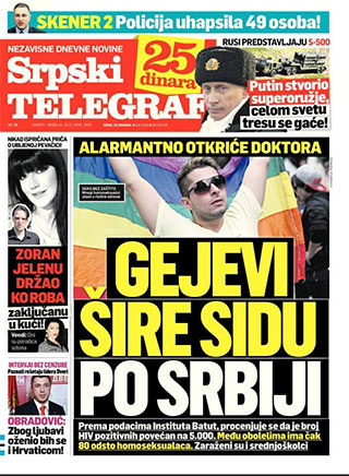 Dvobroj opskurnog beogradskog tabloida "Srpski telegraf" (16-17. april) donio je žestoki napad na gej populaciju, napis kakav se ne pamti još od devedesetih i targetiranja ljudi drugih nacionalnosti, te "izdajnika i plaćenika" u srbijanskim štampanim i elektronskim medijima. Pod naslovom "Gejevi šire sidu u Srbiji", na naslovnoj strani i kombinacijom podataka i nenaučnih, štaviše nerazumnih stavova i mržnje, list donosi potjernicu i ugrožava temeljno pravo na život i bezbjednost osoba zaraženih HIV virusom.