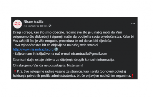 Inicijativa za monitoring europskih integracija BiH pozvala je nadležne institucije da se oglase i postupe povodom informacija koje su objavljene anonimno na Facebook stranici “Nisam tražila”, nakon čega je Agencija za ravnopravnost spolova BiH Ministarstva za ljudska prava i izbjeglice BiH najavila otvaranje kriznih centara za žrtve silovanja u Sarajevu, Mostaru i Banjoj Luci.