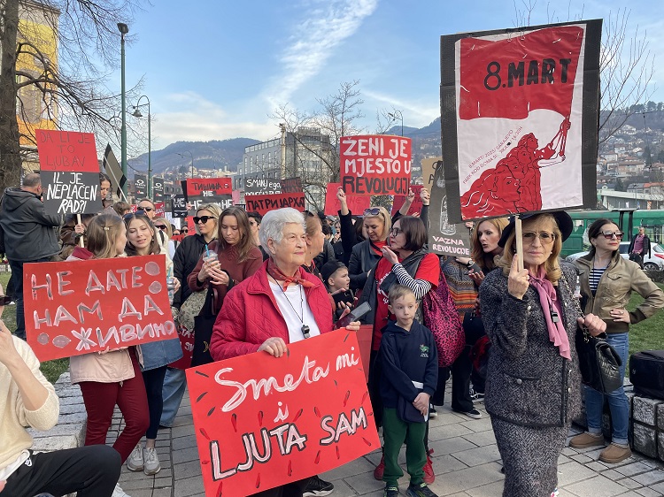 “Smanji ego, povećaj platu”, “Ženi je mjesto u revoluciji”, “Neću da me tlačiš, hoću da me platiš” - neki su od natpisa na transparentima koji su se danas mogli vidjeti na ulicama Sarajeva tokom održavanja ovogodišnjeg Osmomartovskog marša, koji je organizovala neformalna grupa aktivistkinja i aktivista iz Bosne i Hercegovine (BiH).