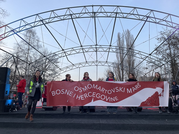 Tradicionalnom osmomartovskom šetnjom skrenuta je pažnja na nepovoljna radnička prava žena u BiH. Stotine građana i građanki iz Sarajeva, Banjaluke, Tuzle i Mostara, danas su na Međunarodni dan žena marširali na ulicama tih gradova za dostojanstveniji rad žena, njihovu veću sigurnost na radnom mjestu i jednake plate. Uz parole i transparente marširalo se i protiv neplaćenog i potplaćenog rada u BiH.