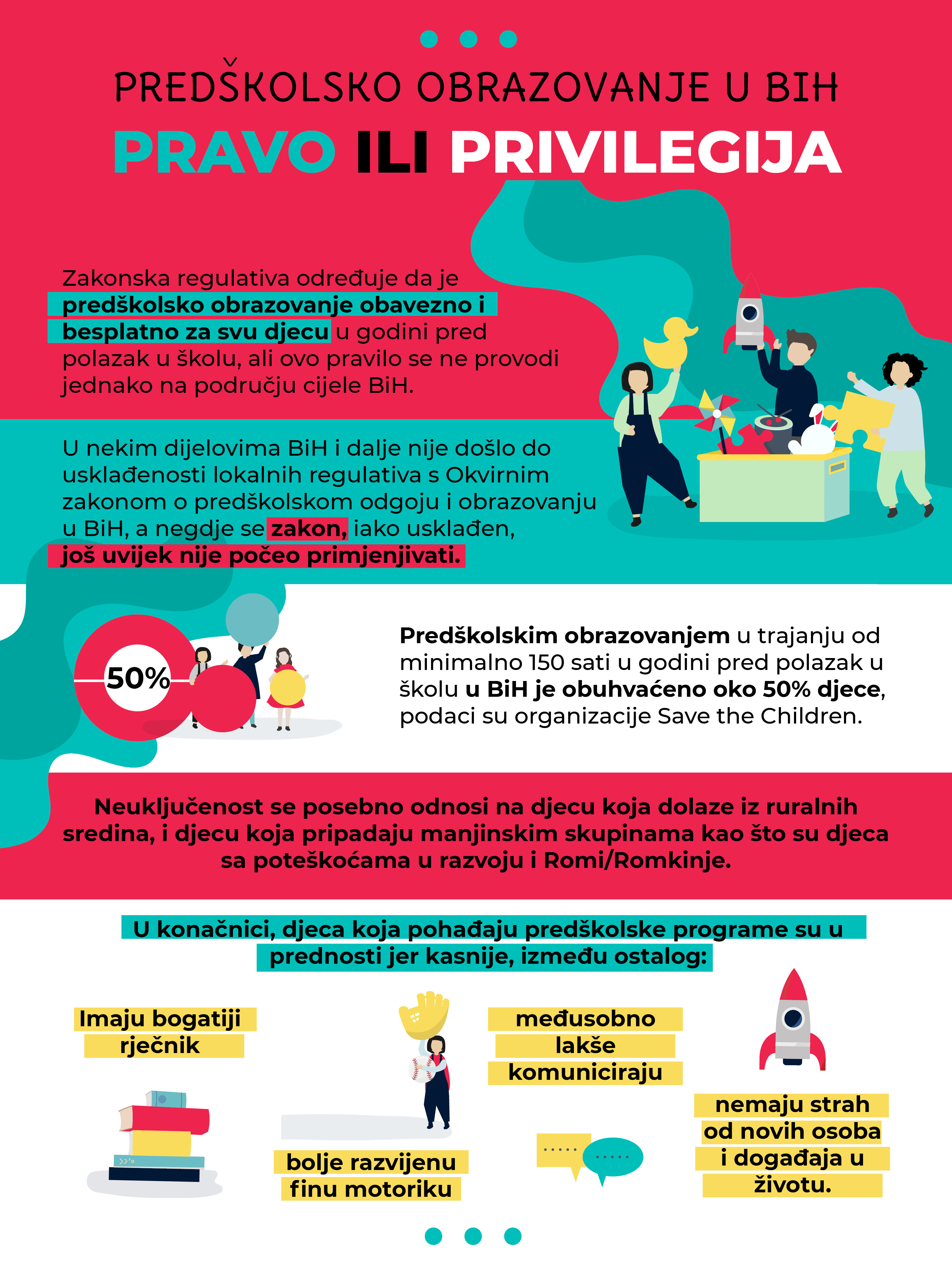 "Najčešći razlozi koji otežavaju pristup obaveznom predškolskom obrazovanju u BiH su siromaštvo, zatim mjesto stanovanja, jer djeca u ruralnim područjima imaju teži ili nikakav pristup predškolskim ustanovama, zatim pripadnost marginaliziranim grupama kao što su djeca Romi, djeca s invaliditetom, djeca bez roditeljskog staranja. U BiH još uvijek nisu uspostavljeni sistemski mehanizmi koji bi osigurali da prepreke s kojima se suočavaju ove grupe djece budu uklonjene", ističe Aleksandra Babić Golubović, savjetnica za javno zagovaranje u organizaciji.