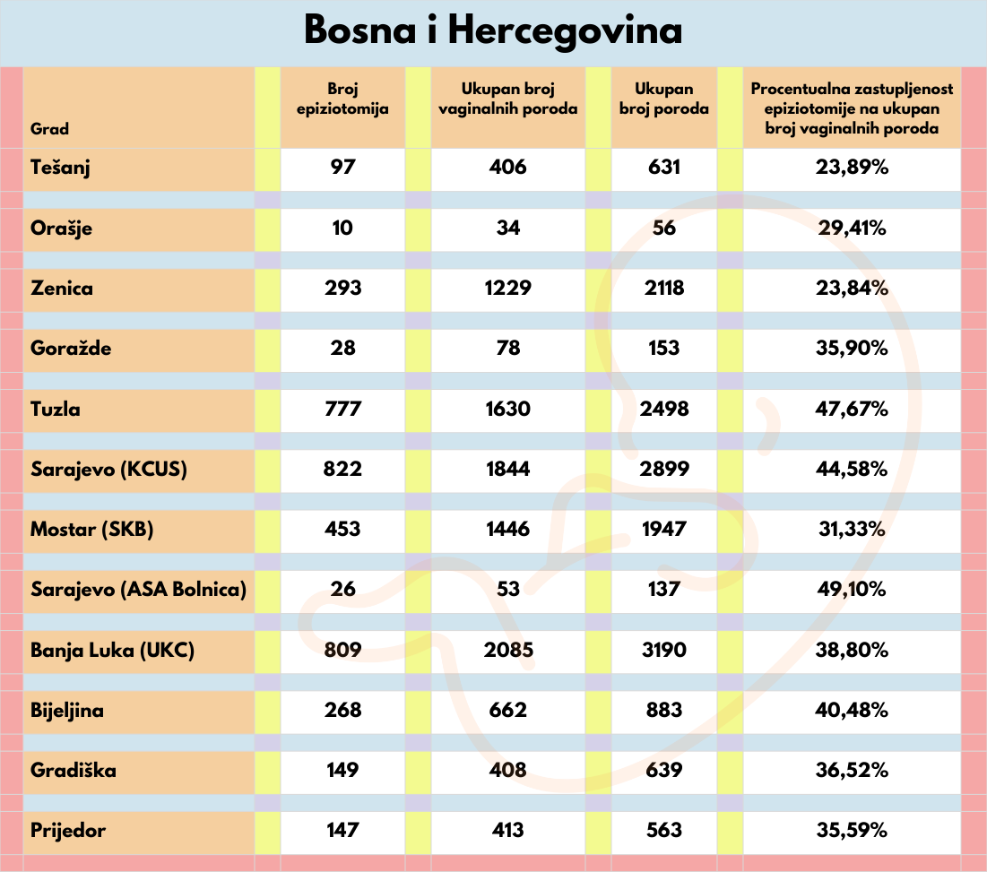 Od 33 bolnice sa porodilištima kojima je poslat upit, iz 12 smo dobili potpune odgovore koji ukazuju na to da se epiziotomija u bh. bolnicama tokom 2024. godine radila u više od 36 posto vaginalnih poroda. Bolnice sa najmanjom stopom urađenih epiziotomija su Opća bolnica Tešanj sa 23.89% i Kantonalna bolnica Zenica sa 23.84%, a najvišu stopu epiziotomija su prijavile privatna bolnica ASA Sarajevo - 49.10% i UKC Tuzla - 47.67%. Zbirne zvanične podatke zatražili smo i od entitetskih ministarstava zdravlja, te Agencije za kvalitet i akreditaciju u zdravstvu u Federaciji BiH, koji ili nisu poslali svoje odgovore do trenutka pisanja ovog teksta ili su nas uputili na druge ustanove.
