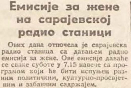 U tekstu naslova „Emisije za žene na sarajevskoj radio stanici“, Sarajevski dnevnik piše kako je prva emisija emitovana 29. jula 1945. godine, te da će se raznim političkim, kulturno-prosvjetnim i zabavnim sadržajem baviti svake subote u 19 sati i 15 minuta.