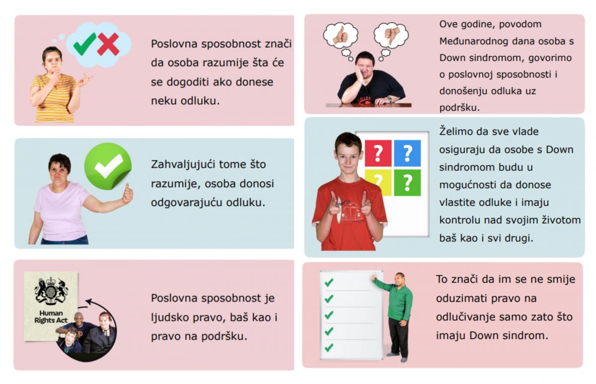 U vodiču se navodi da poslovna sposobnost i pravo na podršku spadaju u osnovna ljudska prava, a oni koji pomažu osobama sa Down sindromom među kojima su članovi njihovih porodica, prijatelji ili stručnjaci bi trebali da ih najbolje poznaju i pomažu u donošenju važnih odluka.