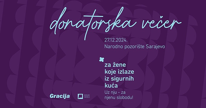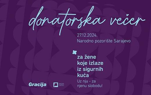 Magazin Gracija i Narodno pozorište Sarajevo (NPS) u petak, 27. decembra ove godine, od 18 sati organizuju Donatorsko veče za žene koje izlaze iz sigurnih kuća, i pozivaju sve zainteresovane da učestvuju u donacijama i pridruže se događaju u NPS.