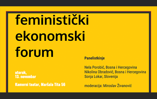 Feminisitički ekonomski forum održat će se 13. novembra u Kamernom teatru u Sarajevu, sa početkom u 11 sati. Govornice na forumu bit će Nikolina Obradović i Nela Porobić iz Bosne i Hercegovine, te Sonja Lokar iz Slovenije. Panel će moderirati Miroslav Živanović, a obezbijeđen je i prevod na engleski.